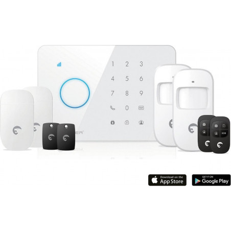 Met dit draadloze alarmsysteem met GSM communicatie kun je op eenvoudige wijze je gehele huis beveiligen. Het systeem is uitbreidbaar met diverse accessoires zoals IP camera's, extra bewegingsmelders, deurcontacten, sirenes, extra RFID tags en rookmelders. De benodigde SIM kaart dient apart aangeschaft te worden (prepaid of abonnement)