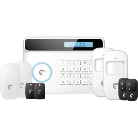 Met dit draadloze alarmsysteem met aansluiting voor een vaste telefoonlijn en optionele SIM kaard (niet meegeleverd) kun je op eenvoudige wijze je gehele huis beveiligen. De basis unit communiceert met je GSM en informeert je door te bellen en/of een SMS te sturen. Het systeem is uitbreidbaar met diverse accessoires zoals IP camera's, extra bewegingsmelders, deurcontacten, sirenes, extra RFID tags en rookmelders. Dit fraaie systeem is standaard voorzien van een digitaal bedieningspaneel. eTIGER levert bij dit alarmsysteem enkele stickers.